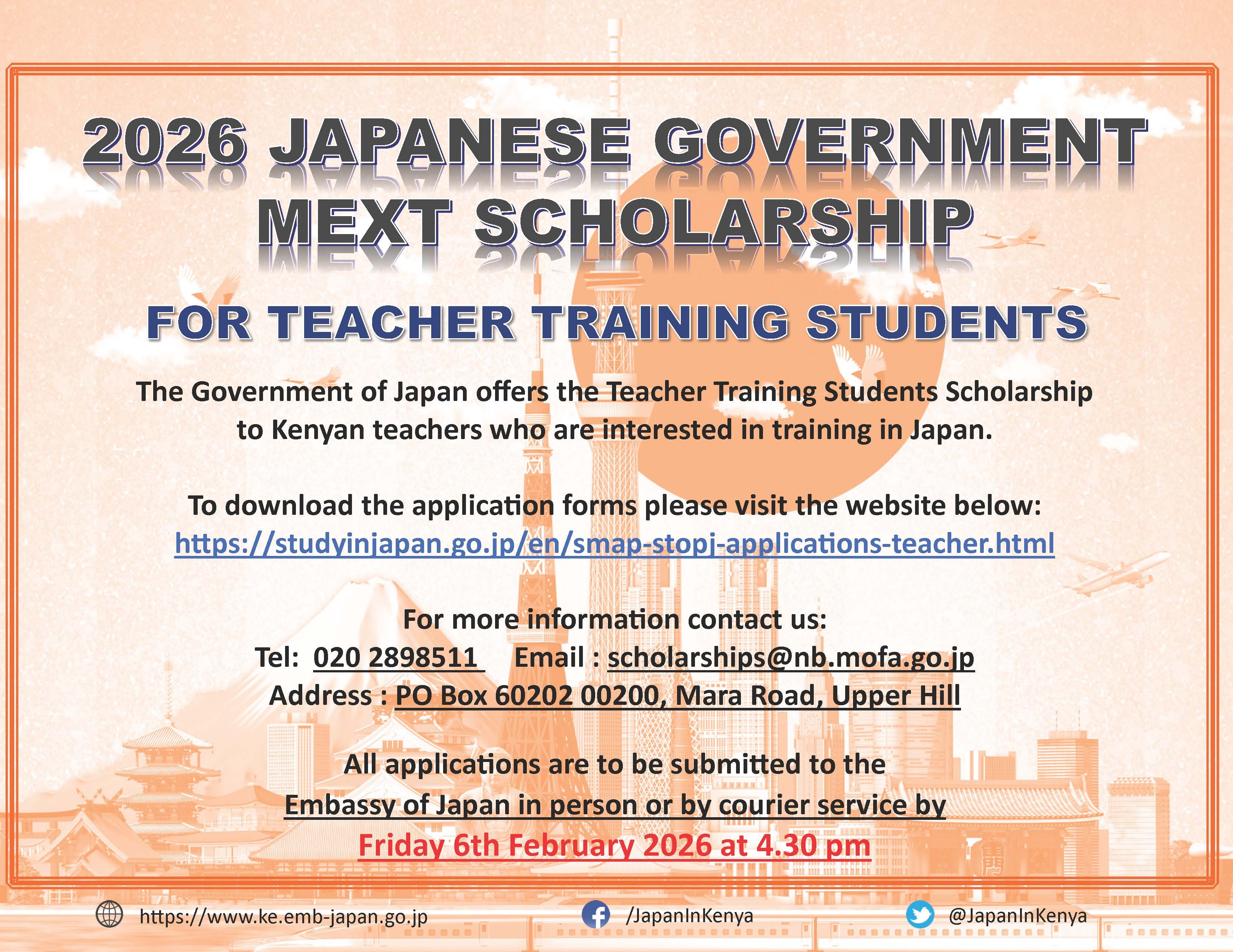 The application window for the 2026 MEXT Teacher Training Scholarship for Kenyan teachers is now open. All applications must be submitted to the Embassy of Japan in Kenya no later than 4:30pm on Friday, 6th February 2026.