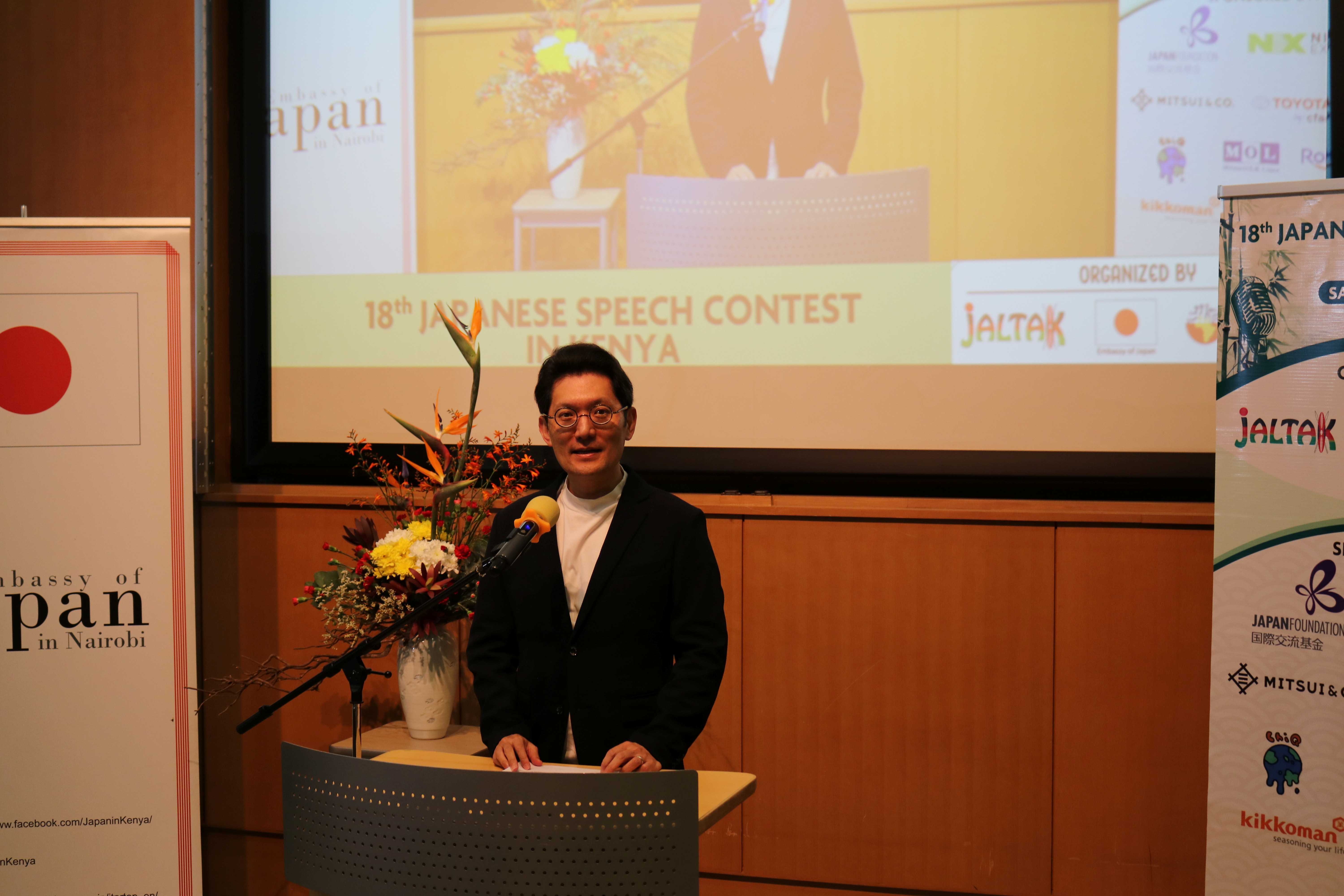 On 14th March (Sat.), Deputy Head of Mission Mr. HORI attended the 18th Japanese Language Speech Contest held in the Multipurpose Hall at Japan Information & Culture Centre of the Embassy of Japan. The competition was co-organised by the Japanese Language Teachers' Association of Kenya (JALTAK), the Nairobi office of the Global Network Project to Promote Study in Japan and the Embassy of Japan with the support of the Japan Foundation, and sponsored by many Japanese companies operating in Kenya.