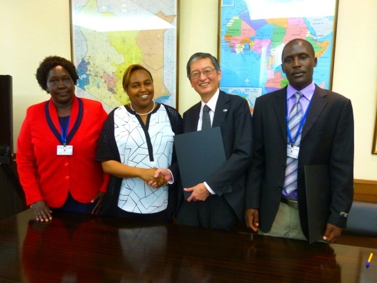 | 【概要】 平成27年度の草の根・人間の安全保障無償資金協力案件に関する贈与契約署名式が在ケニア日本国大使館において行われ、寺田大使と被供与団体の代表者が贈与契約書に署名しました。被供与団体代表者からは、案件の説明及び地域住民への裨益効果、日本政府に対する謝辞が述べられました。贈与契約が行われた2件の分野と内容は、以下のとおりです。