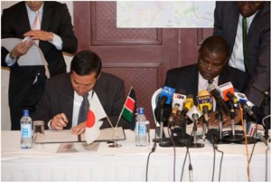 高田稔久大使は6月2日、ナイロビセレナホテルにおいてギタエ・ケニア財務大臣との間で対ケニア無償資金協力「ウゴング道路拡幅計画」に係る合意文書の署名・交換を行いました。また、署名式にはケニア出張中の田中明彦JICA理事長も出席し、本事業に係る贈与契約と円借款事業「モンバサ港周辺道路開発計画」に係る借款契約の署名・交換が同時に行われました。ケニア側からはベット・道路大臣も臨席し、式の模様がケニアの主要テレビ局や新聞で報道されるなど、本プロジェクトに対するケニアの関心の高さが窺えました。